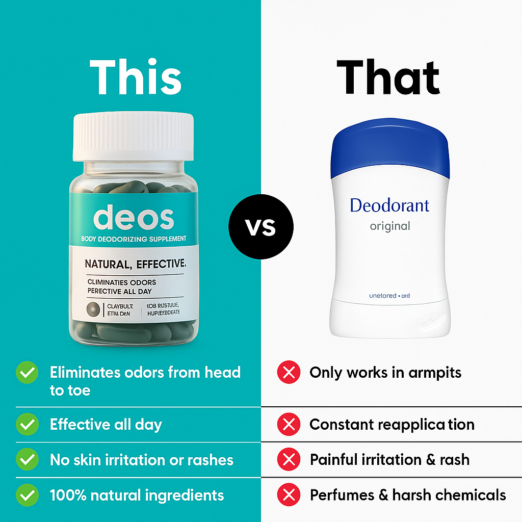 Deos es un suplemento desodorante interno diario elaborado con ingredientes naturales que ayudan a neutralizar el olor corporal de adentro hacia afuera.