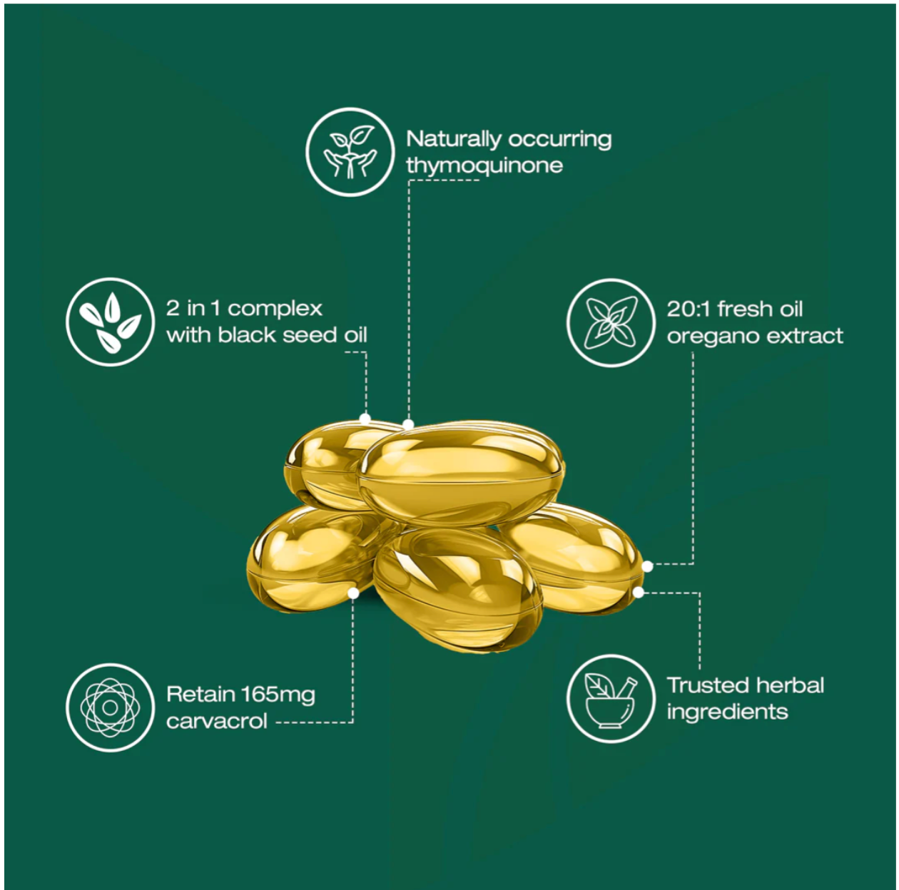 Aproveche el poder del aceite de orégano y el aceite de semilla negra , un dúo sinérgico que ayuda a fortalecer su sistema inmunológico y defenderse contra bacterias , virus y enfermedades estacionales comunes.