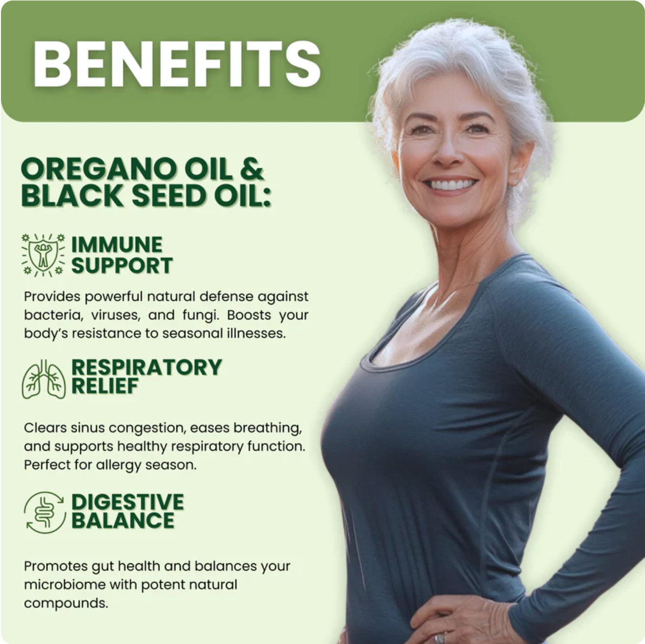 Descubra los potentes beneficios del aceite de orégano y el aceite de semilla negra , una mezcla a base de plantas que apoya naturalmente la inmunidad , la digestión y la salud respiratoria .