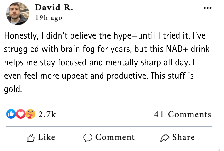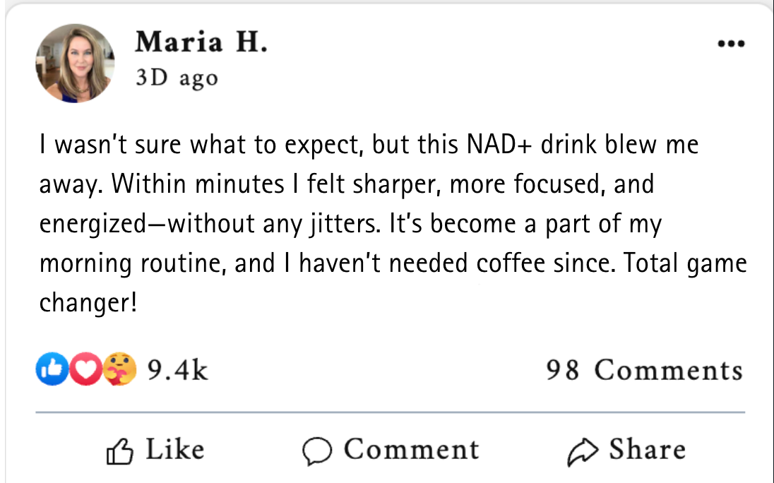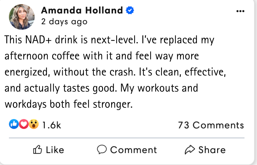 • Creo que el NAD+ es uno de los compuestos más prometedores para favorecer la salud cerebral a largo plazo, la claridad mental y la energía celular. Es una parte fundamental de mi rutina diaria, junto con el ejercicio, un sueño reparador y una nutrición adecuada, para ayudarme a mantener la concentración, la agudeza mental y la energía a medida que envejezco. Si bien aún estamos descubriendo el alcance completo de sus beneficios, los primeros estudios científicos sobre el NAD+ son increíblemente prometedores.